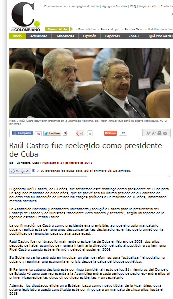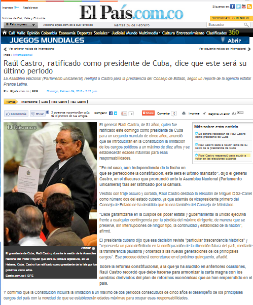 En el periódico El Colobiano.com el titular fue “Raúl Castro fue reelegido como presidente de Cuba” En 7 párrafos explican brevemente como la asamblea nacional reeligió a castro aunque él dice que este será su último periodo de gobierno, También habla acerca del gobierno de castro este se ha “centrado en impulsar un plan de reformas para "actualizar" el socialismo cubano y reanimar una economía en crisis desde la caída del bloque soviético”.