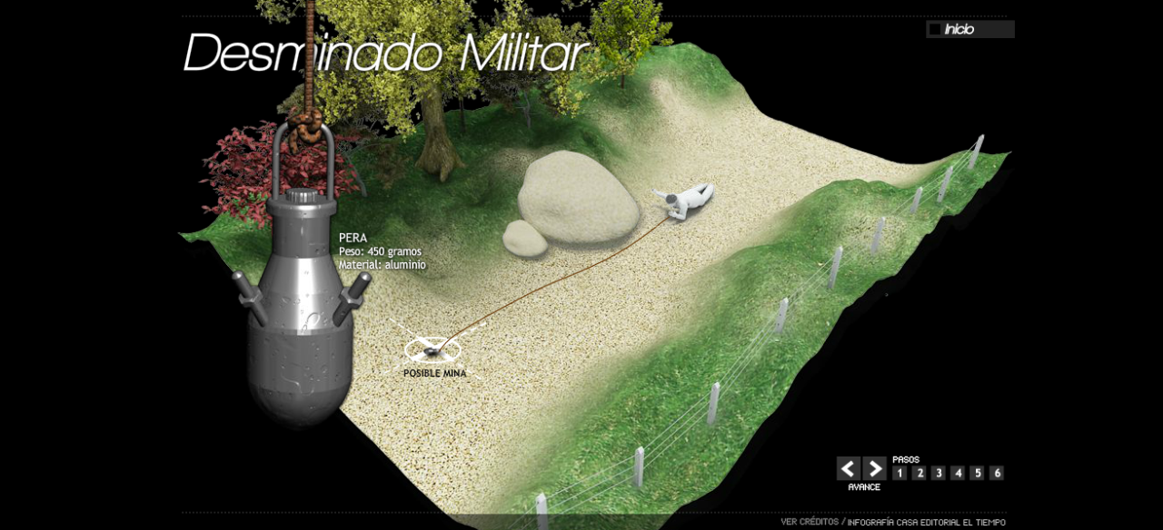 En toda esta interactividad el usuario puede navegar libremente por la infografía y conocer la historia de las minas , o como se el proceso de la activación de las mismas, que están haciendo los ingenieros industriales para el mejoramiento de la calidad de los soldados a la hora de enfrentarse a una mina.